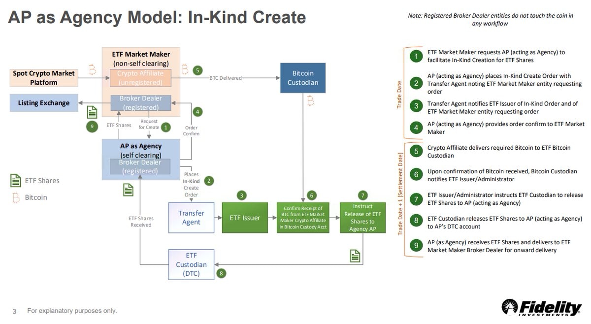 The presentation indicates that Arbitrage and hedge provide more efficiency when it comes to physical creations while self-clearing ETF market maker firms could deliver efficient arbitrage in serving as Agency AP for non-self-clearing ETF market maker firms that have crypto affiliates. As such, according to Fidelity, “Allowing for physical creation and redemption is critical to enhance trading efficiency and secondary market pricing for all participants.”