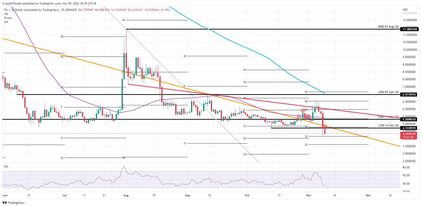 FIlecoin price action is under siege alongside all other major cryptocurrency pairs from massive selling by investors. The already battered asset class will lose several hundred million or even another billion dollars in the market cap if this event takes price action another leg lower. This would mean that Filecoin price is at a new all-time low after a new one was printed on Tuesday at $4.23.