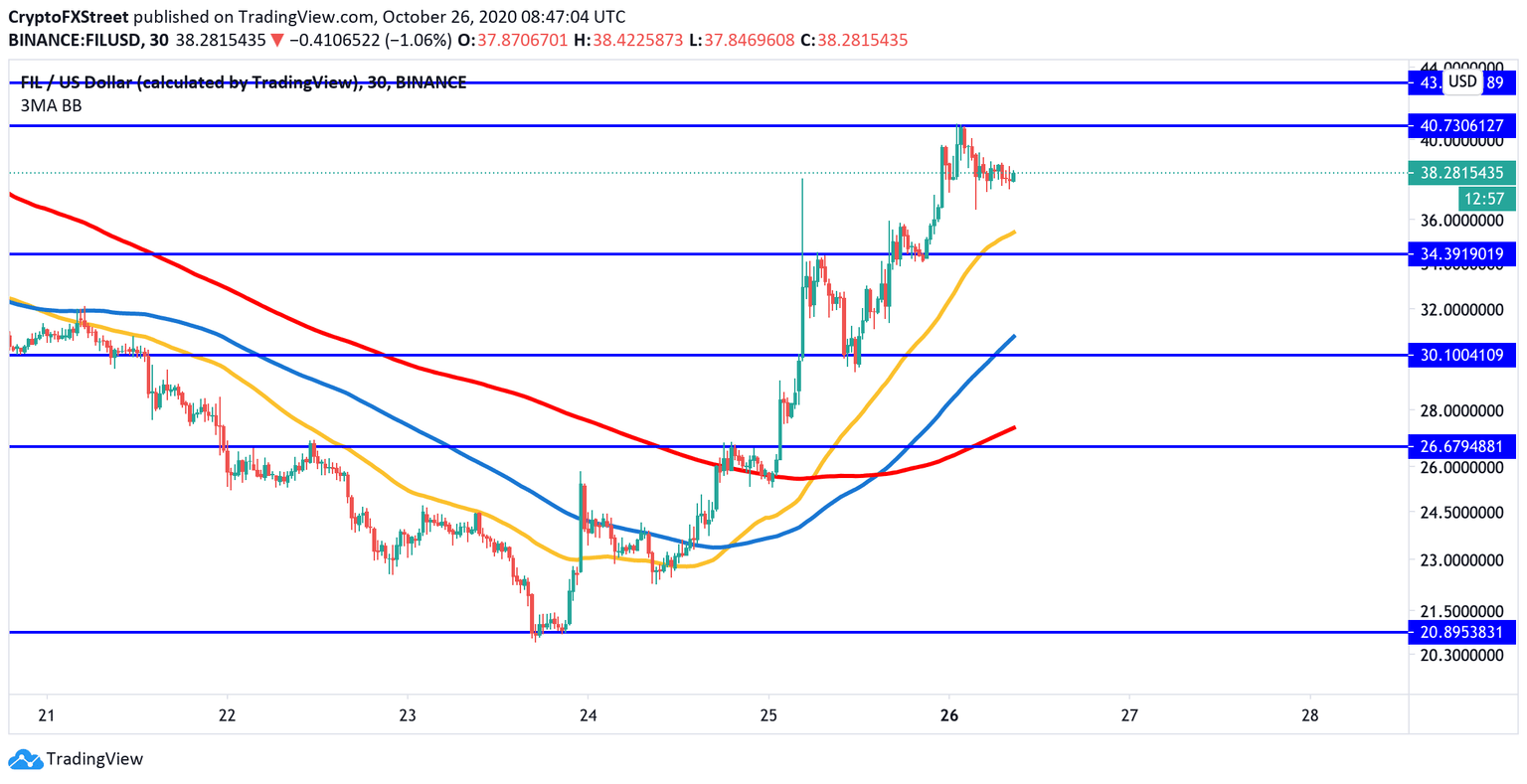 Filecoin has been gaining ground rapidly since the weekend. The token has recovered from as low as $20.63 to $40.8 in less than three days amid significant buying interest in China. At the time of writing, FIL/USD is changing hands at $38.3. Despite the retreat from the recent high, the coin is still 15% higher on a day-to-day basis. As compared to the previous Monday, October 19, FIL's price has increased by over 23%.