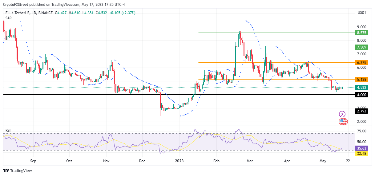 Filecoin (FIL) is auctioning at $4.53 at the time of writing, with the immediate support level at $4.00 pivoting FIL. The altcoin had just turned bullish after the Parabolic SAR flipped below the price. This is bolstered by a bullish signal from the Relative Strength Index (RSI) when it signaled a call to buy FIL upon crossing above the signal line (yellow band) from below.
