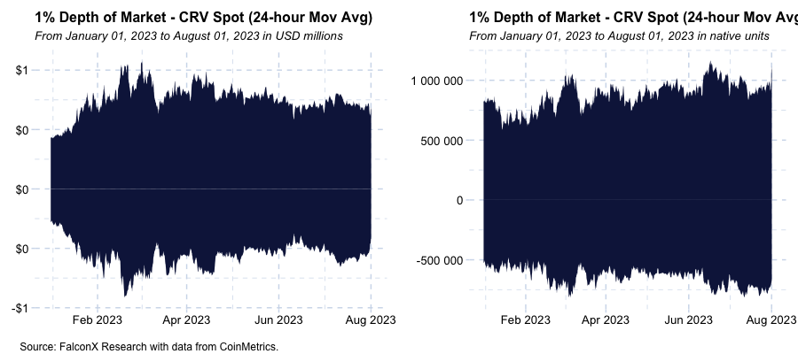 The chart shows 1% market depth for decentralized exchange Curve's CRV token in U.S. dollar terms and native token terms.