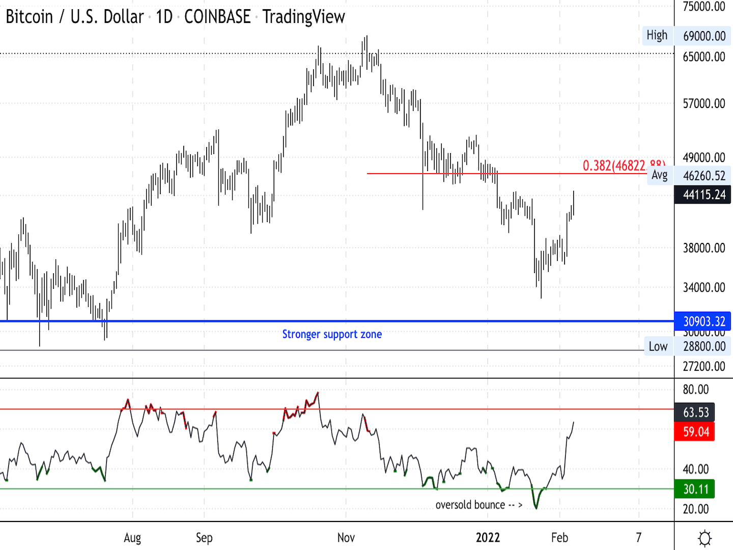The intermediate-term outlook has become less bearish for BTC given the recent price bounce. That means buyers could remain active toward the next level of resistance of $45,000 to $47,000. At that point, a brief pullback is to be expected after retracing 38% of the prior downtrend.