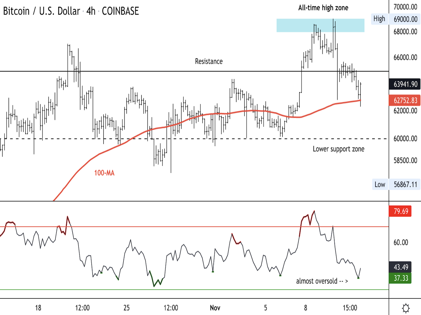 The relative strength index (RSI) on the four-hour chart is near oversold levels, similar to Oct. 27, which preceded a near 10% price rise. This time, however, buyers could face resistance around $65,000 given the loss of upside momentum this week.