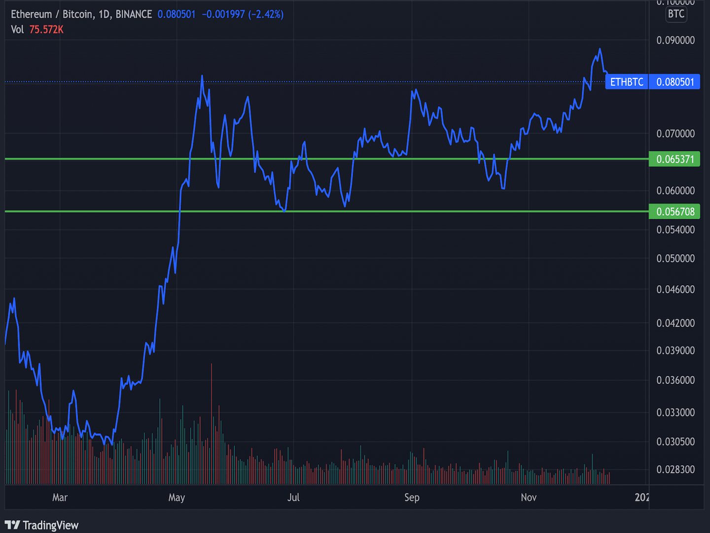 The ether-to-bitcoin price chart, an indicator of bitcoin’s dominance relative to ether, dropped accordingly, after reaching its highest level since 2018.