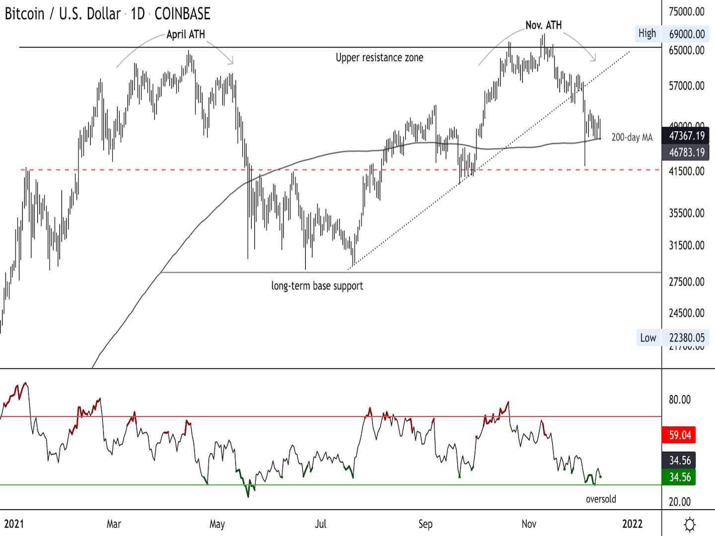 Bitcoin daily price chart shows support/resistance with oversold RSI in second panel. (Damanick Dantes/CoinDesk, TradingView)