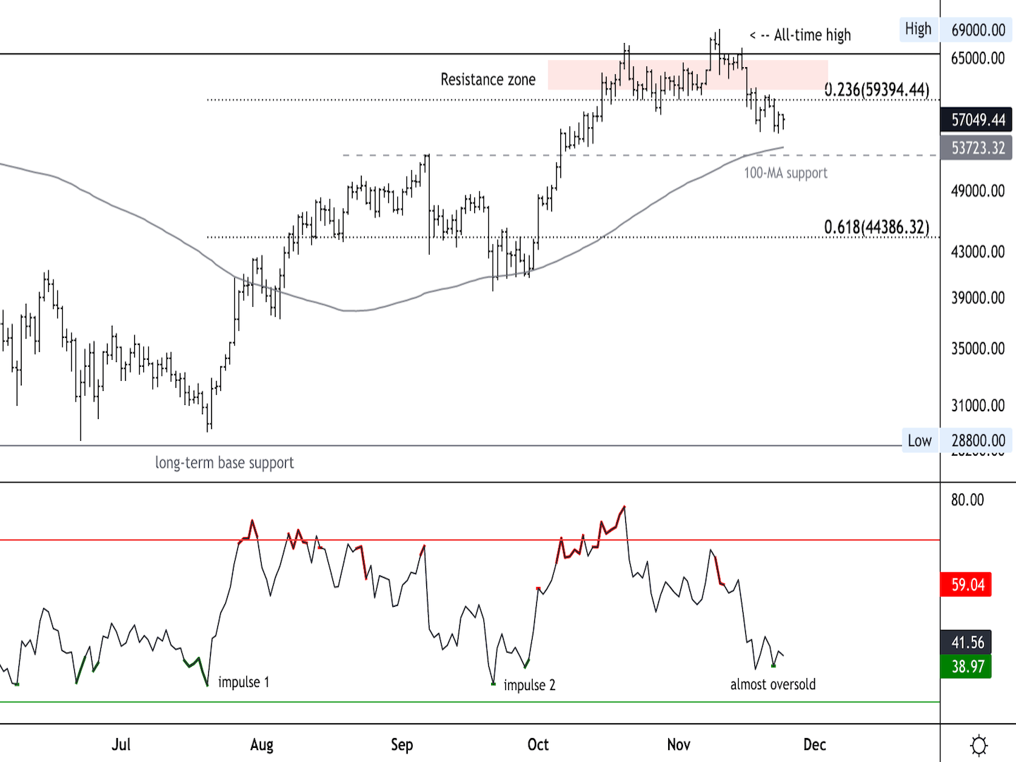 The relative strength index (RSI) on the daily chart is almost oversold, similar to what occurred in late-July and September, which preceded near-50% price rallies. Still, buyers will need to break above the $60,000-$65,000 resistance zone in order to yield upside price targets.