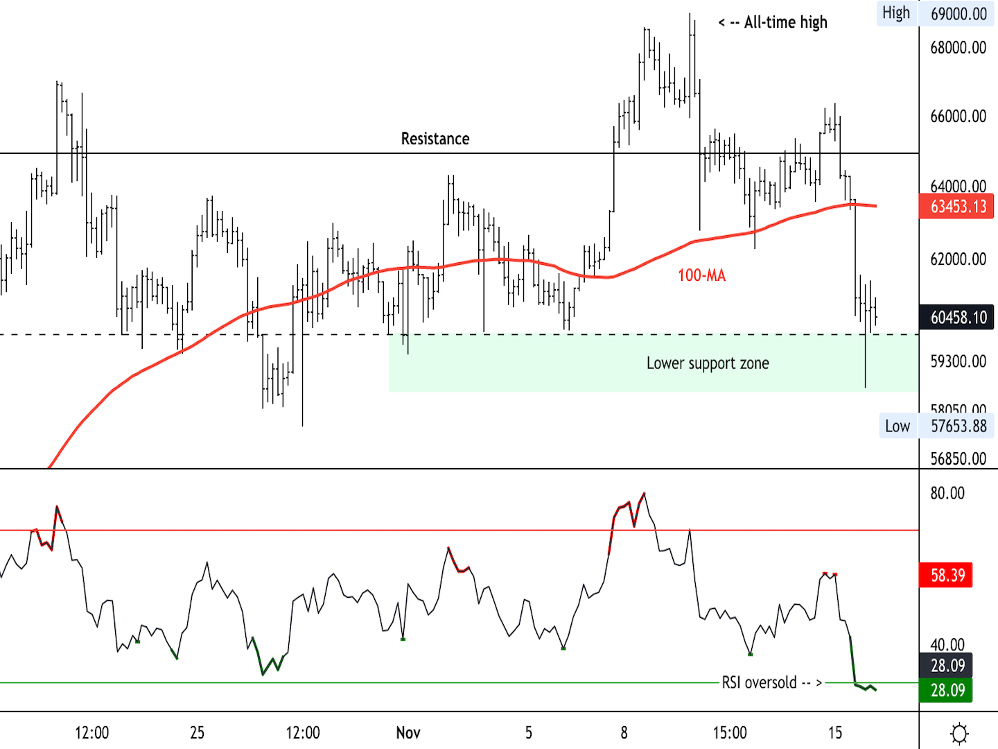 The cryptocurrency was stabilizing around $60,000 support and appeared to be oversold on intraday charts.