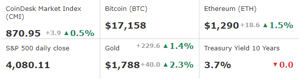 Bitcoin was recently trading over $17,150, up 1.4% over the past 24 hours, and its third consecutive day of gains. The largest cryptocurrency by market capitalization had started surging on Monday amid investor hopefulness that Powell and other Fed officials have found reassurance in economic indicators showing inflation and the threat of a harsh recession waning. BTC sank below $15,500 two weeks ago as markets chewed on Genesis Global Capital's decision to halt withdrawals, part of the fallout from crypto exchange giant FTX's implosion.