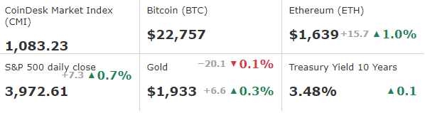 Cryptos' weekend rise followed a positive Friday for equity indexes as the tech-heavy Nasdaq and S&P 500, which has a strong technology component, jumped 2.6% and 1.8%, respectively. Traditional asset markets have looked optimistically at mounting evidence that inflation is waning without casting the economy into a steep recession, and are hopeful that the U.S. central bank will be ratcheting back its next interest rate hike to 25 basis points (bps) from its more recent diet of 75 and 50 bps increases.