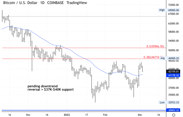 On Thursday, bitcoin extended its pullback from the $45,000 resistance level, although initial support at $40,000 could stabilize the down move.