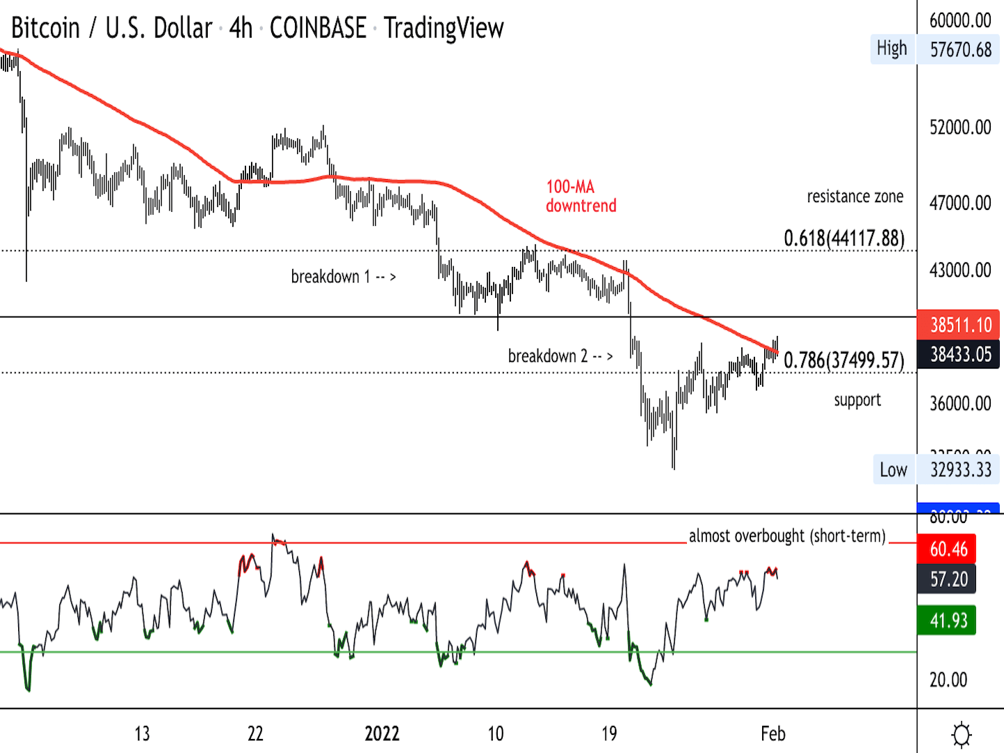 Bitcoin four-hour chart shows support/resistance with RSI on bottom. (Damanick Dantes/CoinDesk, TradingView)
