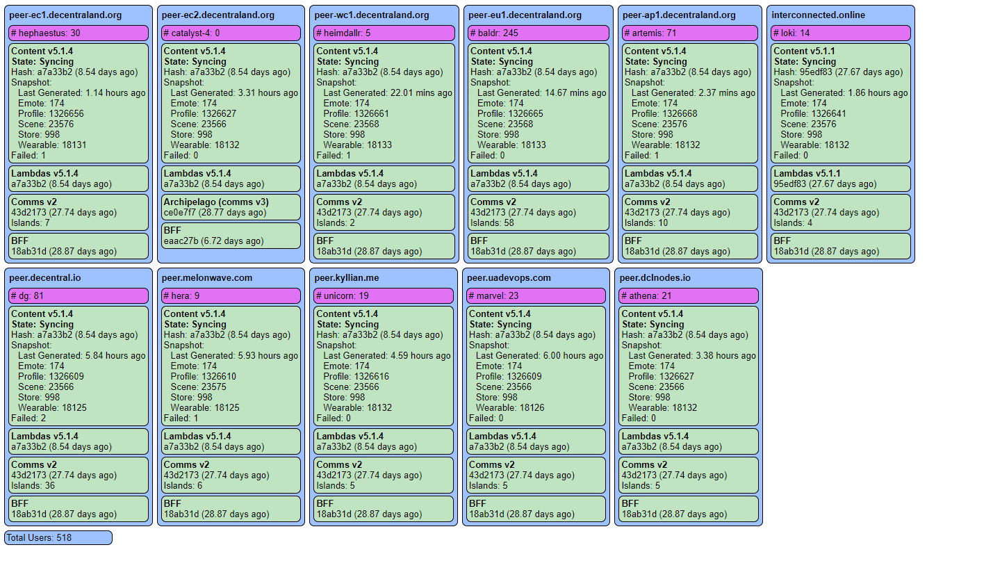 On Github, Decentraland runs something called a Catalyst Monitor, a tool for tracking the load on each of its servers which it calls catalysts.