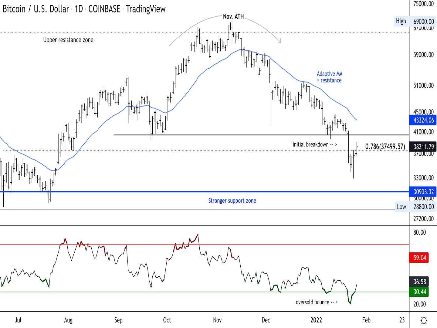 Bitcoin rose from deeply oversold levels over the past two days, indicating renewed buying after a sharp sell-off. The cryptocurrency faces initial resistance at $40,000-$43,000, which could stall the current price bounce.