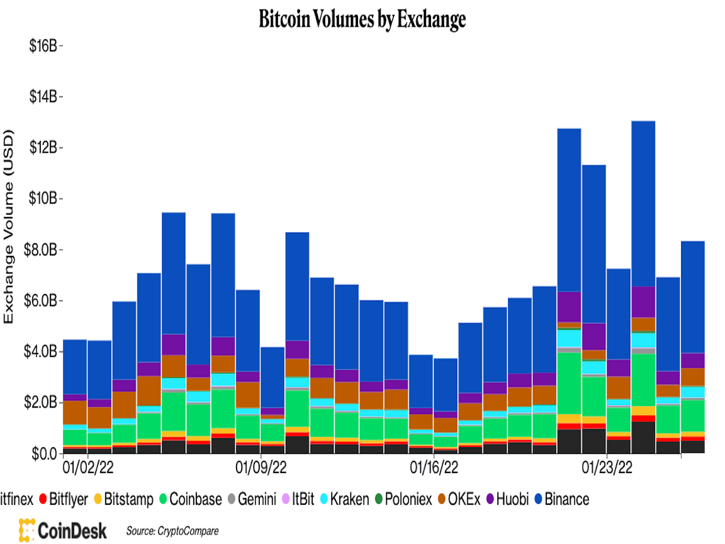 Data compiled by CoinDesk shows that bitcoin’s spot trading volume across major crypto exchanges rose on Wednesday compared with a day ago.