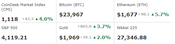 How long bitcoin continues to trade in its current range near or above $23,000 remains unclear with some market observers believing that prices will retreat, but others highlighting more optimistic signs, including the Fed's last two more moderate rate hikes. "Historically, as interest rates rise moderately, as opposed to aggressively the average returns and bitcoin increase massively, more so than traditional assets since the speculators return quickly to buy as the credit and money become more available," CoinDesk Indices Managing Editor Jodie Gunzberg told CoinDesk TV's "First Mover" program.