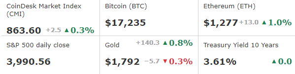 The CoinDesk Market Index (CDI), an index measuring cryptos' performance, was recently up 0.23%.