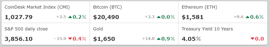 BTC/ETH prices per CoinDesk Indices; gold is COMEX spot price. Prices as of about 4 p.m. ET