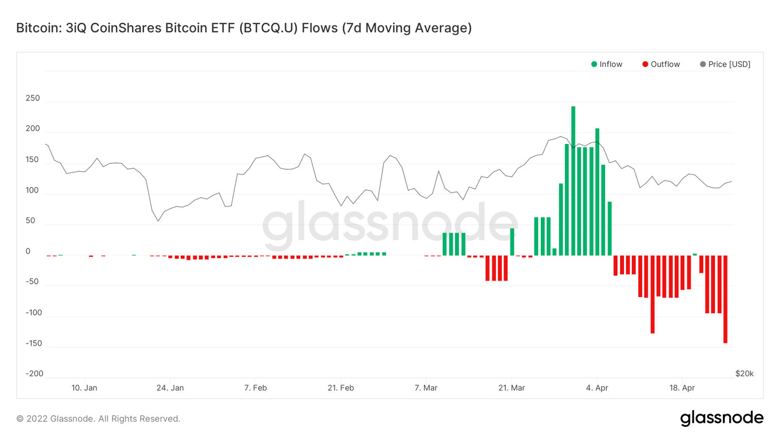 As bitcoin continues its rangebound trajectory, drifting between $37,000 and$45,000, ETF traders seem to have lost interest and are choosing to exit the 3iQ Coinshares bitcoin ETF via redemptions after buying the dip in March. Of course, there have been other periods of outflows but they haven’t been this prominent.