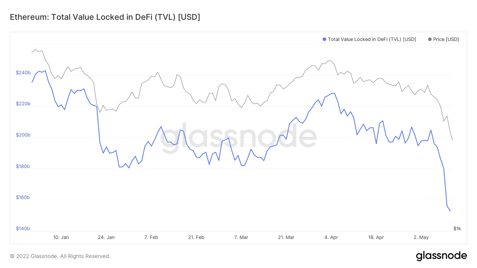 The total locked-in value for DeFi is at $150 billion, down from just under $240 billion at the start of the year and from $230 billion a month ago, according to Glassnode data.