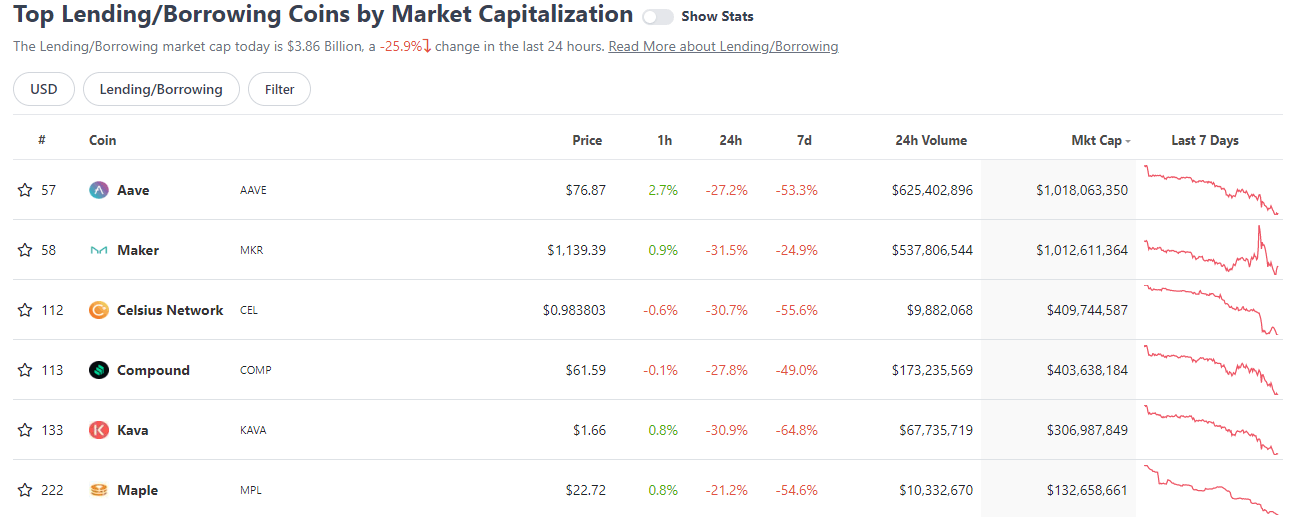 Lending protocol prices aren’t taking well to this dash for the exit. Across the board, the tokens of major lending protocols are down with aave falling 53% over the past week. Celsius has dropped 55.6% over the past week and compound has fallen 49% during that time.