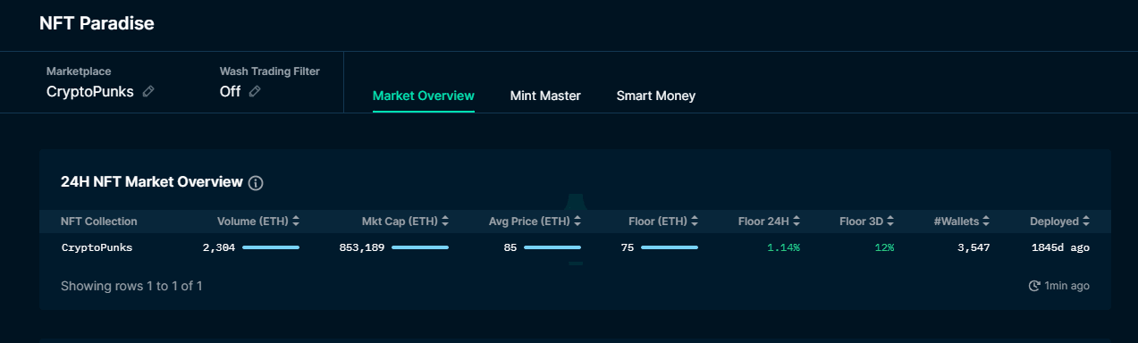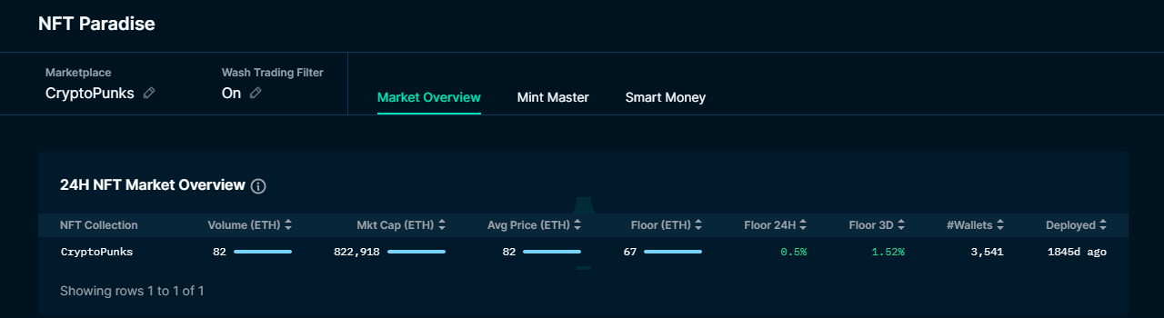And for wash trading on Crypto Punks themselves? Well, it runs rampant. Using Nansen’s wash trading filter, we can see that the filtered 24-hour volume is 82 ether while the unfiltered volume, including wash trading, is closer to 2,304 ether.