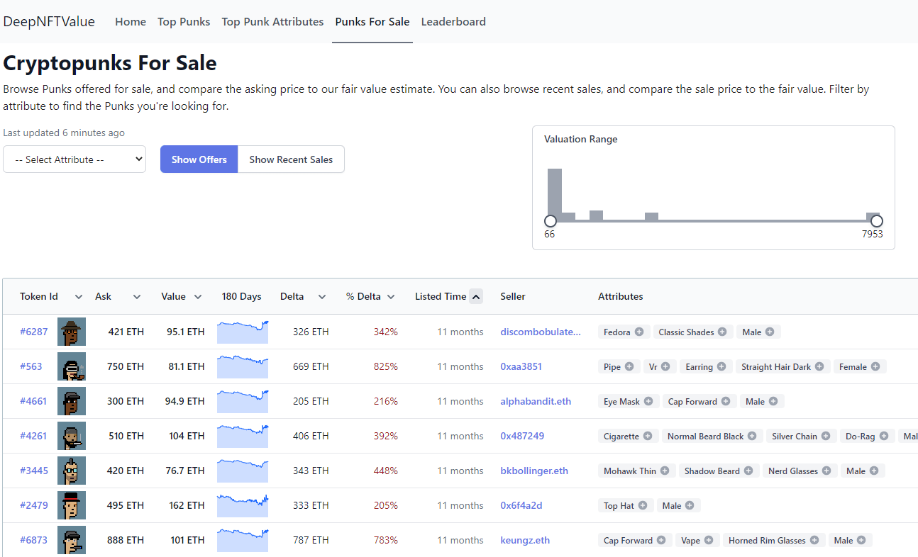 DeepNFTValue uses an artificial intelligence-based pricing algorithm to determine a CryptoPunk’s value (the team is expanding it to Bored Apes next) and compare it to the asking price and time on the market.
