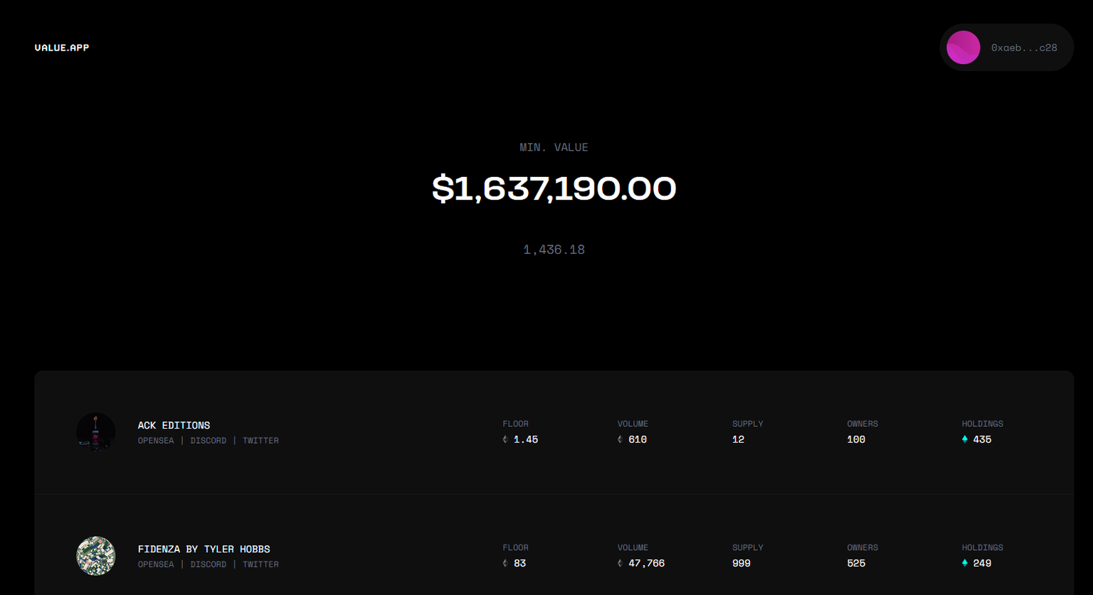 Tools that only use floor prices for the collection value the wallet at much less. Value.app, which tracks the floor prices exclusively, puts the wallet's value at around $1.63 million.