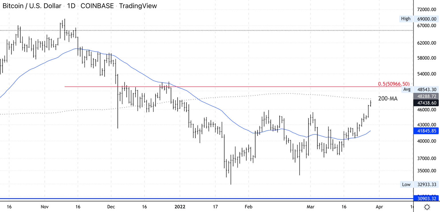 The cryptocurrency broke above initial resistance at $46,000, although stronger resistance at the 200-day moving average, which is now at $48,289, could stall the relief rally.