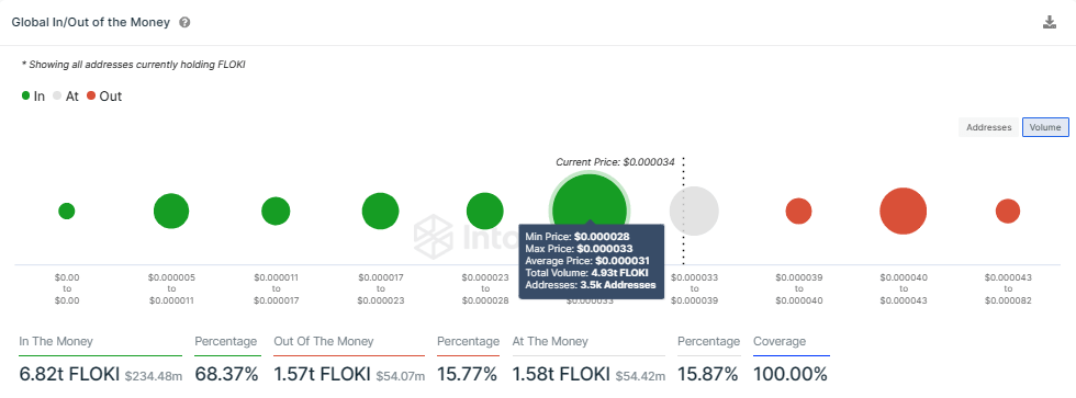 Data from on-chain aggregator IntoTheBlock’s Global In/Out of the Money (GIOM) indicator shows there is robust support extending downward from $0.00003300 to $0.00002800. Any efforts to push Floki price south will be countered by buying pressure from 3,500 addresses that bought approximately 4.93 trillion FLOKI tokens at an average price of $0.00003100.