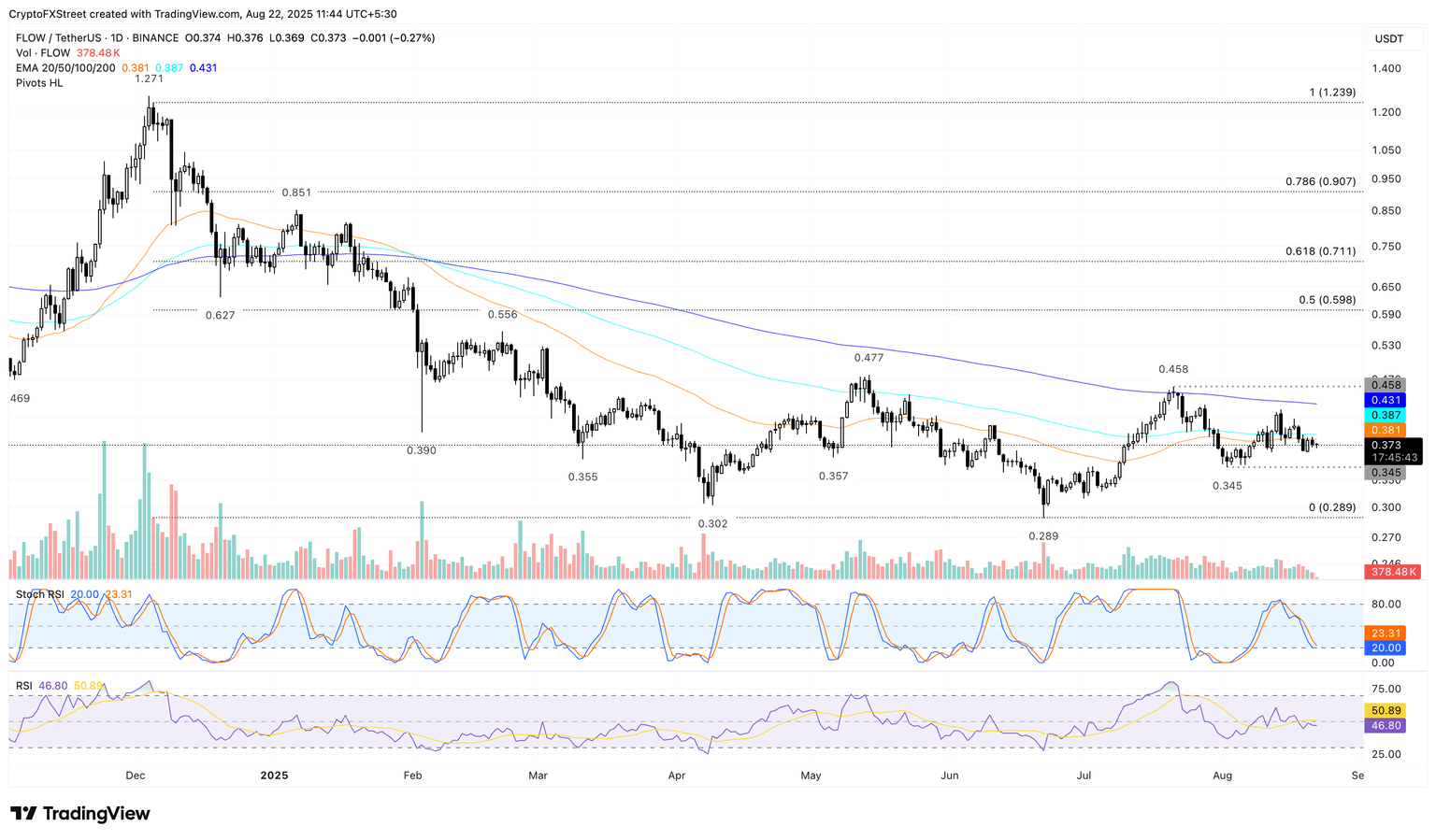 FLOW trades at $0.373 at press time on Friday, keeping a sideways track on the daily chart, between the previous two pivot points of $0.458 on July 21 and $0.345 on August 2. The multi-role architecture token struggles to overcome the 50-day Exponential Moving Average (EMA) at $0.381 while the declining 100- and 200-day EMAs suggest a long-term bearish trend in motion.