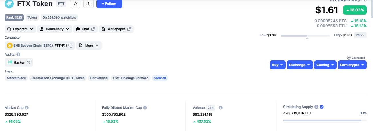 - FTX token price is up almost 20% alongside a 24-hour trading volume surge of around 430%.