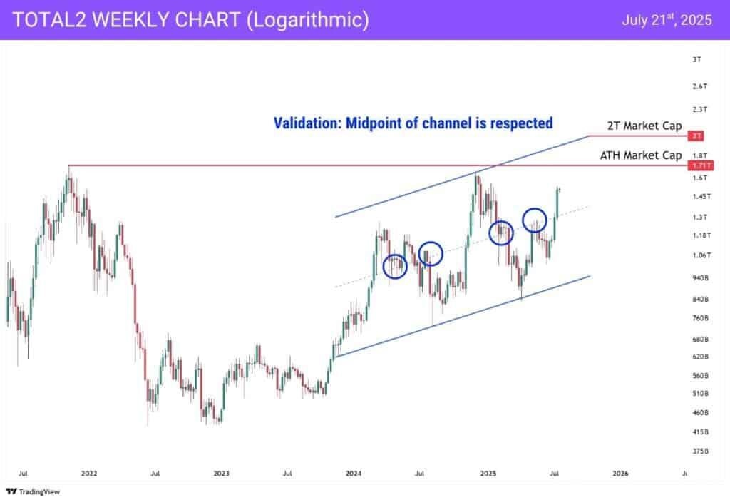 TOTAL2 — which tracks the altcoin market excluding BTC — is pushing toward the top of a rising logarithmic channel that’s been intact since late 2022.
