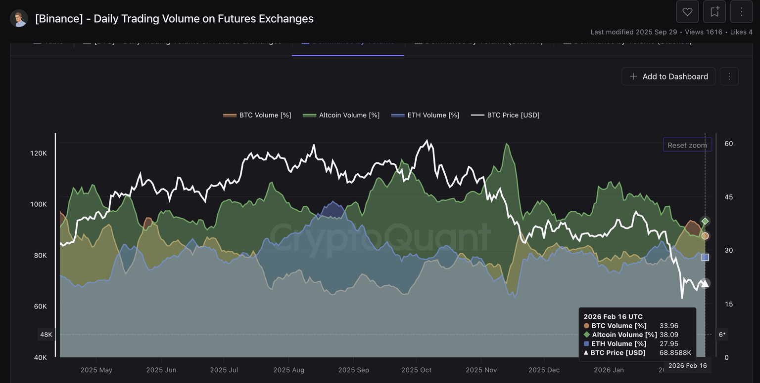 Meanwhile, on-chain data show a significant shift in volume from the altcoin market toward Bitcoin. According to CryptoQuant, altcoin volume was 38.09% on Monday, down from roughly 59.83% on November 13. Bitcoin volume has increased to 33.96% from 20.71% in the same time period, indicating that investors are shifting to Bitcoin as a relatively safe haven for capital preservation amid a bear market.