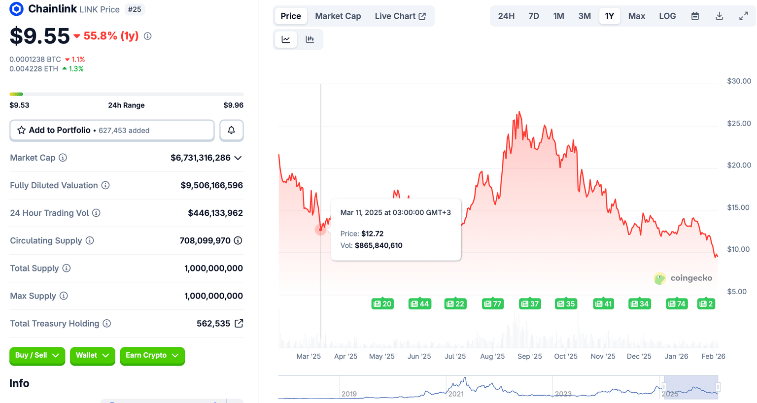 Chainlink is trading at $9.55, down nearly 3% intraday and 20% in the past week. The oracle token has sustained a long-standing downtrend over the past year, with returns averaging -56%, per CoinGecko data. LINK traded at a record high of $52.70 in May 2021 and has since lost nearly 82% of its value.