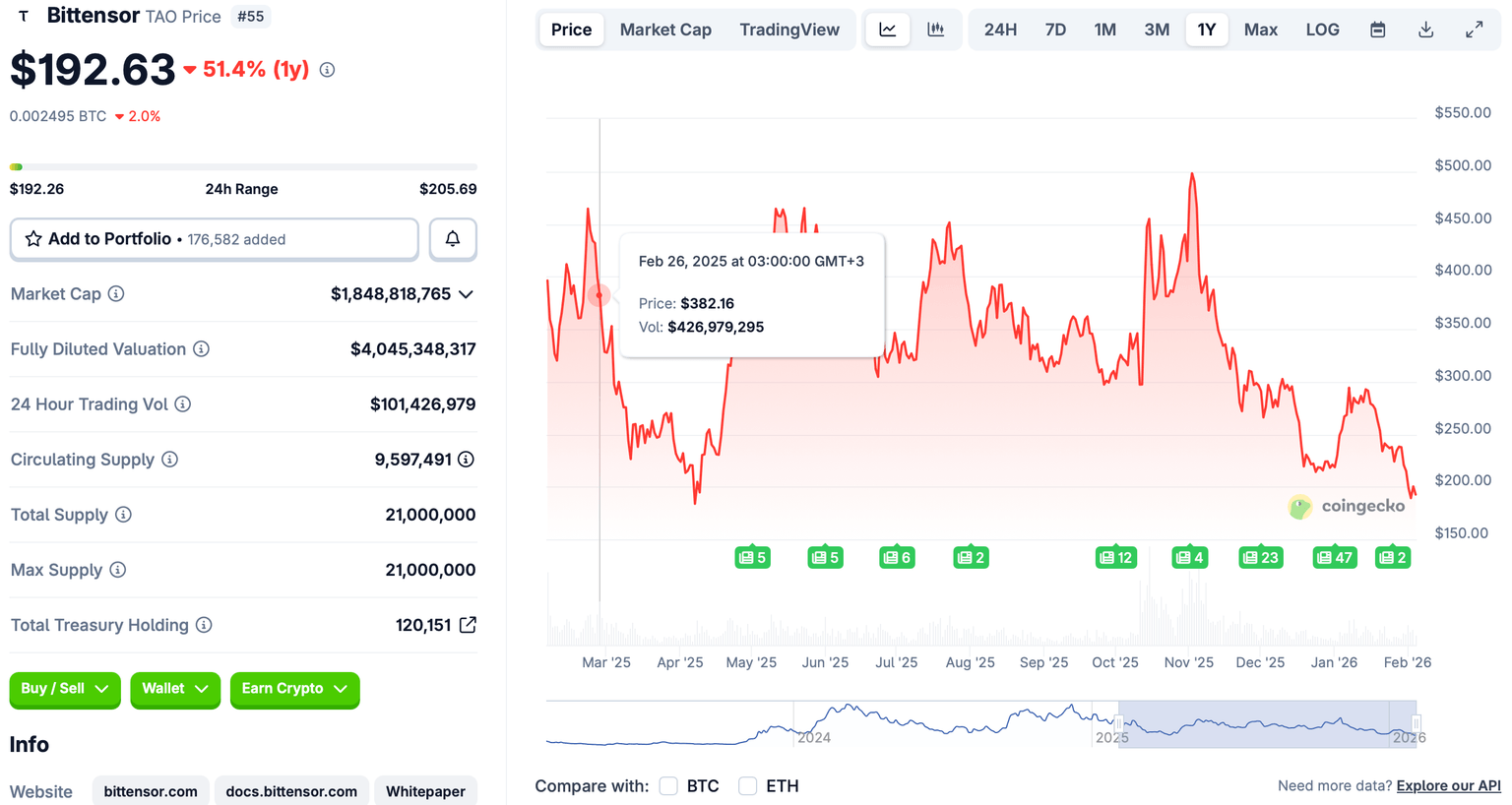 Bittensor’s performance over the past year has been overall bearish, with a return of -51%. The token is trading at $192 at the time of writing, down 3.6% in the last 24 hours, 16% over the past week and 27% in the past month. Bittensor has a market capitalization of $1.8 billion and ranks 55th in the crypto market.