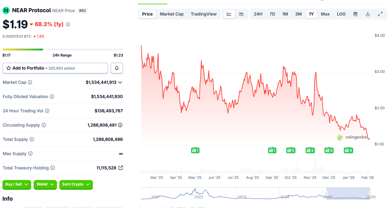 Near Protocol is also on the back foot, with the largest negative return of the three AI tokens at 68%. The token hovers at $1.19 at the time of writing, down 2.7% in 24 hours, 18% over the past week, and 31% over the past 30 days. NEAR has a market capitalization of $1.5 billion and ranks 62nd in the crypto market.