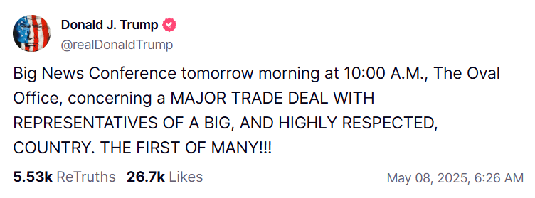 Trump said on the Truth Social platform that he would hold a news conference at 10:00 in Washington, DC (15:00 BST), to announce an agreement with "representatives of a big, and highly respected, country."