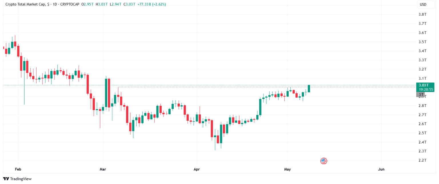 The total cryptocurrency market capitalization reached above $3 trillion on Thursday, as shown in the chart below.