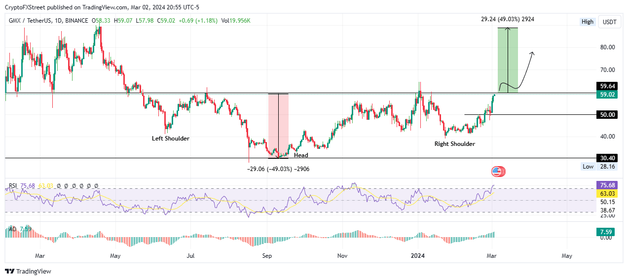 - GMX could make a 49% climb if the price manages a daily candlestick close above $59.64 bullish.