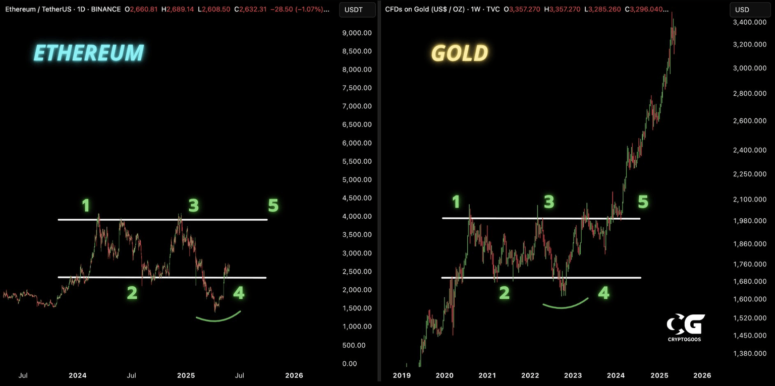A side-by-side comparison of ETH and gold charts shows Ethereum mirroring gold’s multi-year accumulation structure from 2019 to 2024.