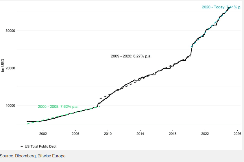 Gold’s resilience has led central banks to now hold more Gold than US Treasuries in their reserves for the first time since 1996. Moreover, the US public debt, as shown in the graph below, has ballooned to $36 trillion – 123% of the Gross Domestic Product (GDP) – and has been growing at an alarming 7.43% annually since April 2020, according to data from Bitwise Europe and Bloomberg.