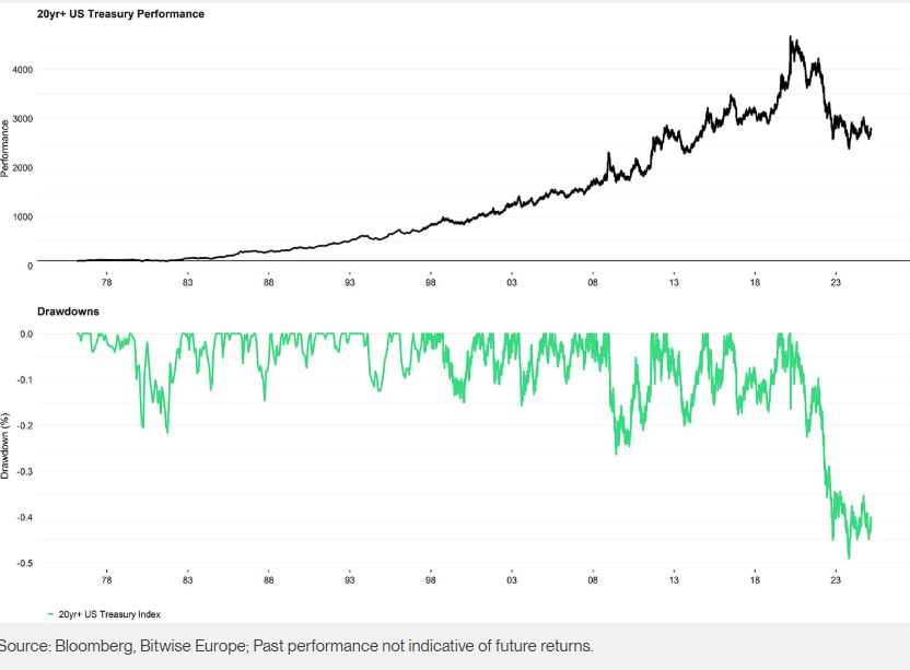 Additionally, a rise in inflation expectations and geopolitical tensions following the 2022 Russian-Ukrainian war has eroded trust in US Treasuries, resulting in their worst performance in history, underperforming Gold significantly.