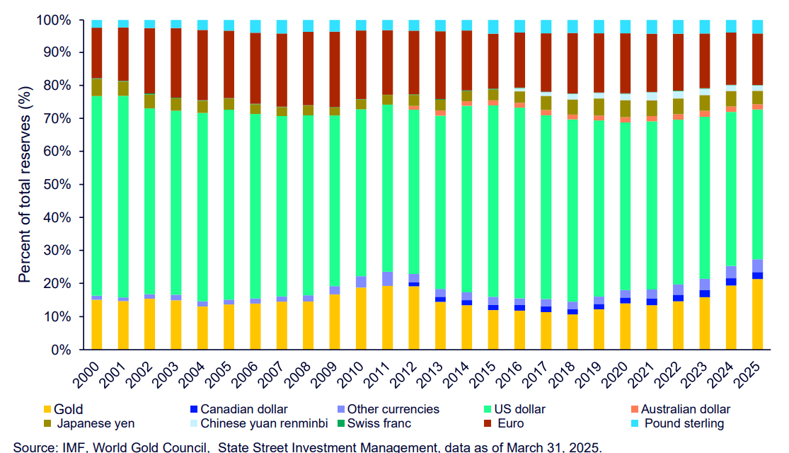 Moreover, Gold’s share of Global Reserves has climbed to levels not seen in about 30 years, reaching 21% as of Q1 2025, according to State Street Investment Management. Additionally, the World Gold Council reports 26.8% as of Q2 2025. This upward trend underscores Gold’s role as a leading alternative to fiat instruments and further solidifies its case as a structural hedge in the world.