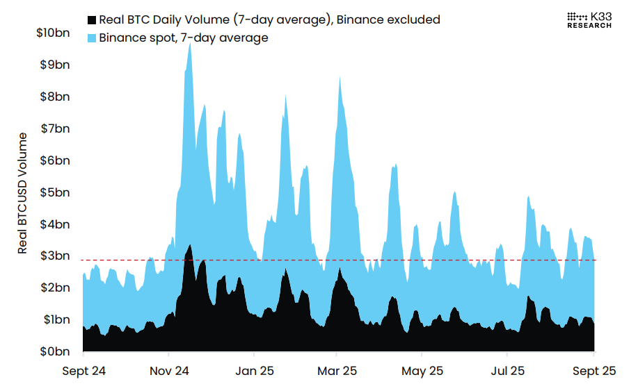 “While trending lower, activity has been consistently high, with less weekly variance since mid-July, compared to Q2 – a sign of a vibrant spot market amidst BTC’s continued consolidation in the $110,000 range,” reports K33 analyst.