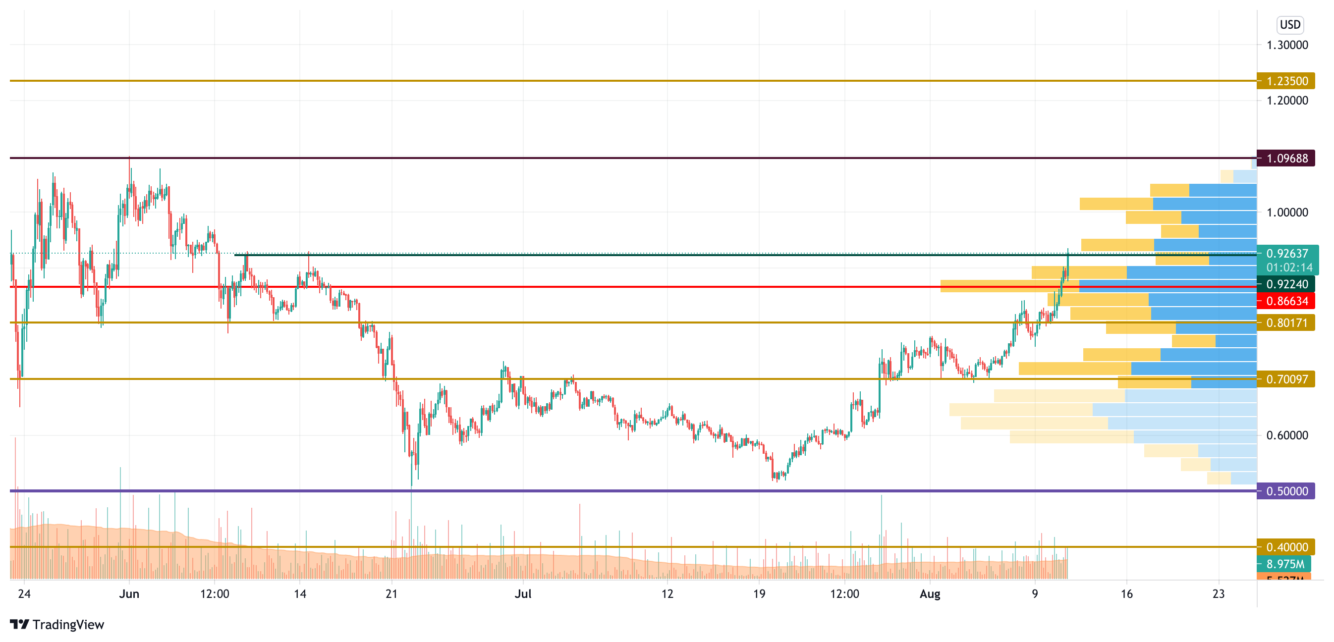 Yesterday morning, the XRP price held above the key level of $0.80 and, during the day, buyers managed to continue the rise. At night, the bulls broke through the target level in the form of the POC line ($0.869).