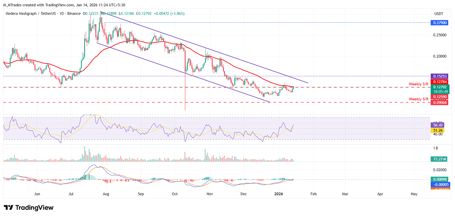 If HBAR closes above the 50-day EMA at $0.127 on a daily basis, it could extend the rally toward the upper trendline boundary of the wedge pattern at around $0.152.