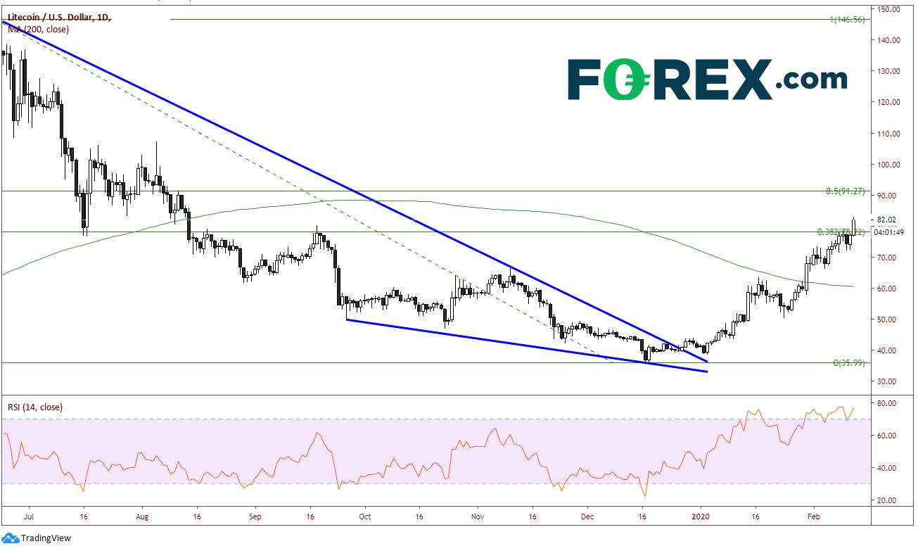 Not the be outdone, LTC and XRP have moved in similar fashion to BTC and ETH. Both moved lower from the June highs, and both broke higher out of falling wedge formations in later December 2019. However, both LTC and XRP have only been able to retrace to the 38.2% level from the June 2019 highs to the December 2019 lows. Still, LTC is at $82.15, up 6.7% today, while XRP is at $.3029, up 7.55% today. Notice once again how the RSI’s are also in overbought condition but are still pointing higher.