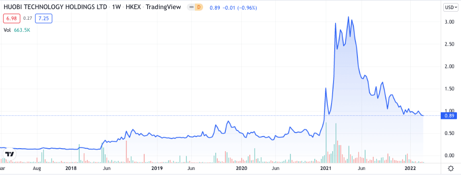 Amid Huobi Technology’s entry into the crypto industry, the company’s stocks saw a sharp increase last year, briefly topping above $3 in April 2021, according to data from TradingView. The stock subsequently plummeted afterwards, dropping below $1 in late 2021.