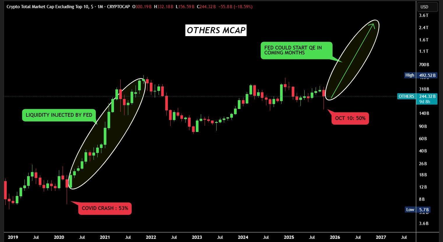 Another analyst, digital asset investor “Crypto GEMs,” shared a chart highlighting the last time the US central bank injected liquidity, which kicked off altseason.