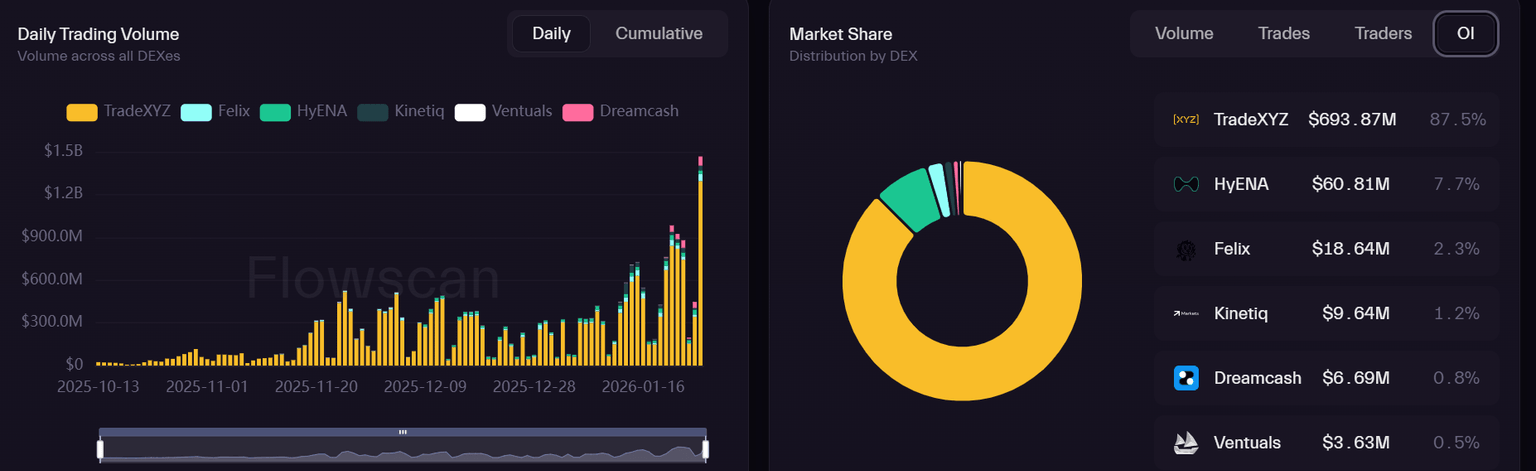A majority of the open interest and trading volume growth on HIP-3 stems from the platform TradeXYZ, which enables commodities and equities trading. According to Flowscan data, the platform recorded a daily trading volume of $1.29 billion over the past 24 hours, with open interest at $693.8 million at the time of publication.